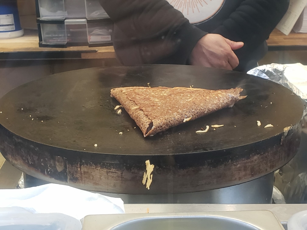 Une crêpe au fromage ? Justement, à cinquante mètres de là, une petite boutique de crêpes au comptoir ouvert sur la rue répand sur le trottoir une délicieuse odeur de pâte et de sucre.